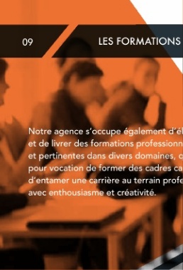 09 LES FORMATIONS Notre agence s’occupe également d’él et de livrer des formations professionn et pertinentes dans divers domaines, q pour vocation de former des cadres cap d’entamer une carrière au terrain profe avec enthousiasme et créativité. 20
